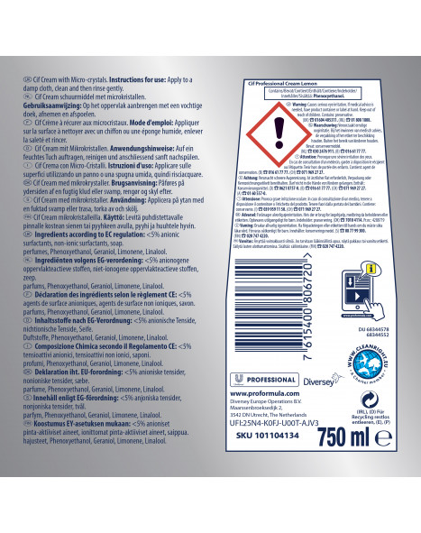 Cif Pro Formula Schuurcrème is een veelzijdige reiniger, die miljoenen natuurlijke reinigingsdeeltjes bevat en een uitstekend resultaat geeft op hardnekkige vlekken zonder kwetsbare oppervlakken te beschadigen zoals email en lak. De unieke formule van de Cif Crème reinigt tot in de diepte om oppervlakken weer tot leven te brengen. Het kan worden gebruikt als een keukenreiniger voor het reinigen van kookplaten, gootstenen en keukentegels, evenals een badkamerreiniger om badkuipen, gootstenen en badkamertegels te reinigen.